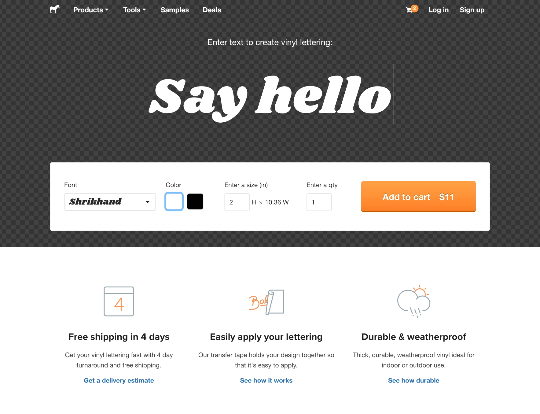This was one of my first React apps and the first design-online product at Sticker Mule. I built it using a combination of elements: text input, text display UI and a hidden canvas. By rendering the text to a hidden canvas, the pixel data could be used to accurately calculate the precise dimensions of the custom lettering with any custom font, which were then used to calculate the price. The canvas image data was also used to generate the product image for the cart, checkout and order pages.