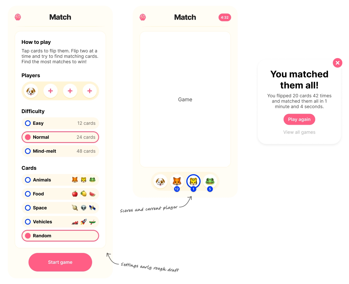 Brain Power Games started from playing an IRL memory card matching game with my kids. I thought it would be fun to build a web version which would mix and arrange the cards for you. I built the first version in CodePen, which became the first game, Match.